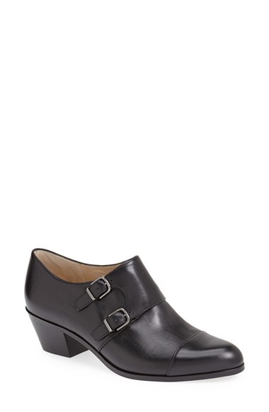 A borrowed-from-the-boys monk strap scaled to feminine proportions gives a nod to one of the season's hottest trends on a polished Italian-leather bootie. Color(s): black leather. Brand: Via Spiga. Style Name: Via Spiga 'Cielo' Leather Monk