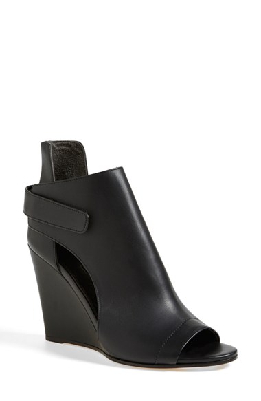 Curvaceous cutouts, an exaggerated heel counter and a streamlined wedge create clean, architectural lines on a season-spanning peep-toe bootie. Timeless aesthetics meet modern sophistication in Vince's collections of iconic, wearable essentials-alway