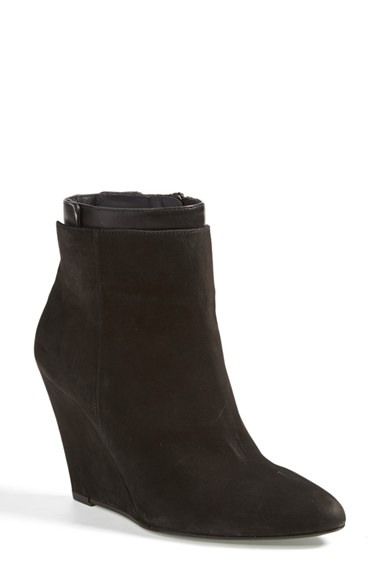 Supple leather and lush nubuck create modern contrast on a layered-look pointy-toe bootie set on a sleek covered wedge. Timeless aesthetics meet modern sophistication in Vince s collections of iconic, wearable essentials-always focusing on distinctive des