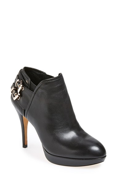 Polished buckle straps highlight the suave profile of a platform ankle bootie cast in finely grained leather. Color(s): black leather. Brand: VINCE CAMUTO. Style Name: Vince Camuto 'Elaina' Bootie (Women). Style Number: 498190 1.