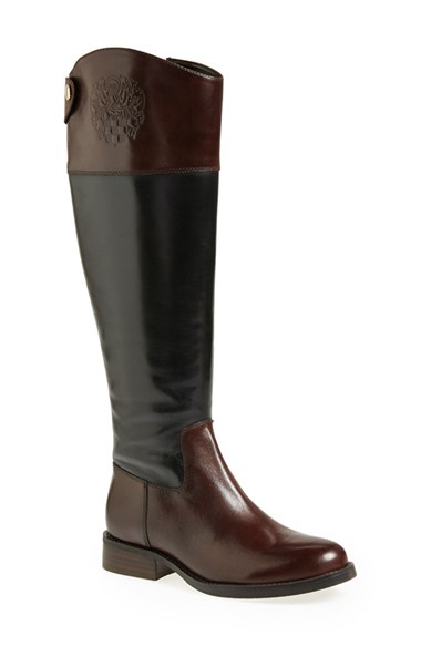 An embossed logo lends understated elegance to a knee-high boot in rich mixed-finish leathers. Color(s): black, dark woodbury/ black. Brand: VINCE CAMUTO. Style Name: Vince Camuto 'Fabina' Knee High Boot (Women). Style Number: 714926.