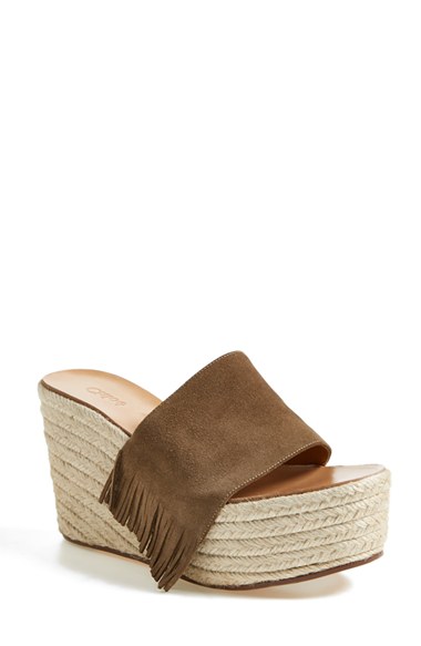 A slide sandal nods to the season's '70s focus with a jute-wrapped platform wedge and a flirty dash of fringe. Color(s): khaki. Brand: Chloe. Style Name: Chloe 'Eliza' Platform Wedge Sandal (Women). Style Number: 866123.