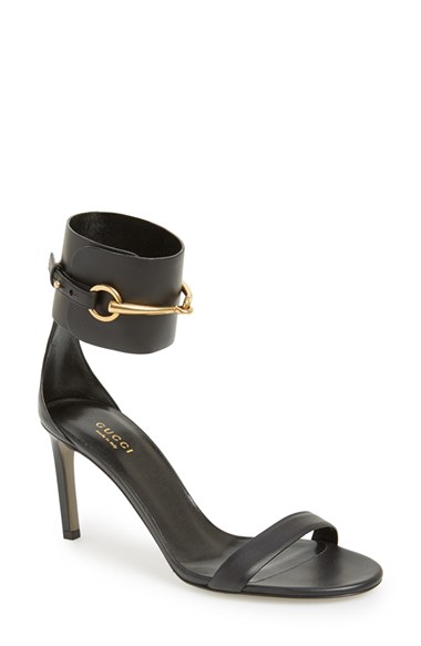 Signature hardware dominates the ankle cuff of a modern sandal with equestrian edge. Color(s): black, brown. Brand: Gucci. Style Name: Gucci 'Ursula' Sandal. Style Number: 640953.