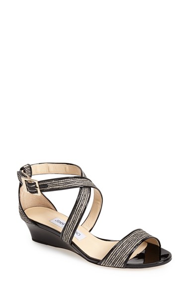 Glittering stripes highlight the finely textured woven straps of an elegant, streamlined wedge sandal accented with liquid-shine patent leather. Color(s): natural / black. Brand: Jimmy Choo. Style Name: Jimmy Choo 'Chiara' Wedge Sandal (Women). Style Number: 884789.