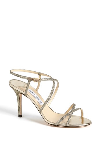Glittering straps cross atop a minimalist sandal with a mirrored midsole and a slender heel. Color(s): light bronze. Brand: Jimmy Choo. Style Name: Jimmy Choo 'Elaine' Sandal. Style Number: 943278.