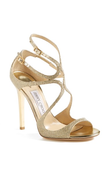 Glittering straps twist around a scintillating sandal perched on a slender mirrored heel. Color(s): gold, light bronze. Brand: Jimmy Choo. Style Name: Jimmy Choo 'Lang' Sandal. Style Number: 668716.