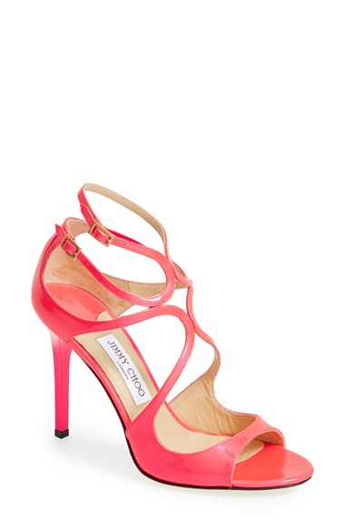 Couture curves sculpt the swanky straps of a patent-pop sandal set on a slender heel. Color(s): geranium. Brand: Jimmy Choo. Style Name: Jimmy Choo 'Lang' Sandal. Style Number: 668714.