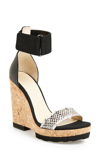 A snake-embossed strap and bold cork wedge extend the retro sophistication of a striking ankle-strap sandal. Pre-order this style today! Add to Shopping Bag to view approximate ship date. You'll be charged only when your item ships. Color(s): natural/ black. Brand: Jimmy Choo. Style Name: Jimmy Choo 'Lottie' Platform Wedge Sandal (Women). Style Number: 838442.