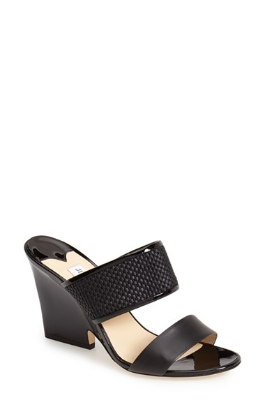 Sleek double bands-one in tightly woven fabric, one in buttery-soft leather-style a graceful sandal lifted by a glossy, sculpted wedge. Pre-order this style today! Add to Shopping Bag to view approximate ship date. You'll be charged only when your item ships. Color(s): black. Brand: Jimmy Choo. Style Name: Jimmy Choo 'Marsa' Dual Strap Sandal (Women). Style Number: 883754.