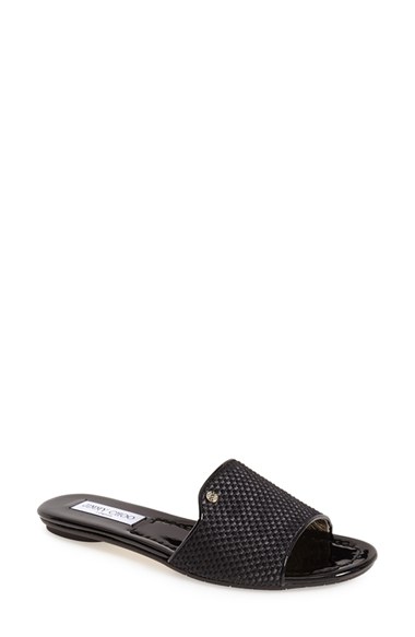 A slim, elegant slide sandal features a subtly textured, basket-weave upper edged in glossy patent piping. Pre-order this style today! Add to Shopping Bag to view approximate ship date. You'll be charged only when your item ships. Color(s): black. Brand: Jimmy Choo. Style Name: Jimmy Choo 'Nanda' Sandal (Women). Style Number: 884072.