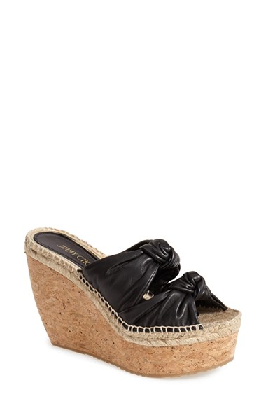 Knotted straps in buttery-soft leather top a sky-high wedge lifted by an earthy cork wedge and wrapped with braided espadrille trim. Pre-order this style today! Add to Shopping Bag to view approximate ship date. You'll be charged only when your item ships. Color(s): black. Brand: Jimmy Choo. Style Name: Jimmy Choo 'Priory' Knotted Double Band Wedge (Women). Style Number: 883995.