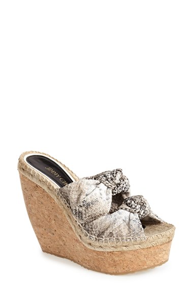 Knotted straps in snake-embossed leather top a sky-high wedge lifted by an earthy cork wedge and wrapped with braided espadrille trim. Pre-order this style today! Add to Shopping Bag to view approximate ship date. You'll be charged only when your item ships. Color(s): natural. Brand: Jimmy Choo. Style Name: Jimmy Choo 'Priory' Knotted Double Band Wedge (Women). Style Number: 884020.