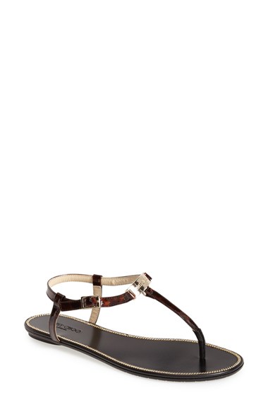 A logo-etched goldtone bar joins the glossy tortoiseshell-print straps of a breezy thong sandal detailed with delicate goldtone chain trim circling the footbed. Color(s): safari. Brand: Jimmy Choo. Style Name: Jimmy Choo 'Wave' Flat Thong Sandal (Women). Style Number: 884078.