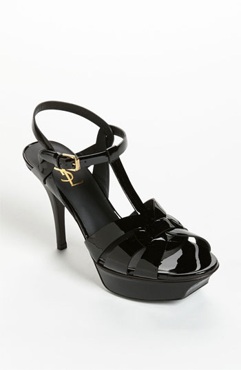 Liquid-shine patent leather composes a gorgeous T-strap sandal. Color(s): beige, black, fog, fuchsia, maroon, pink, royal blue, wine. Brand: Saint Laurent. Style Name: Saint Laurent 'Tribute' T-Strap Sandal. Style Number: 655052.