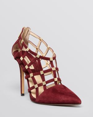 Valentino's iconic pyramid studs glint on the caged straps of a signature pointy-toe leather pump for a look that's rock-chic, yet refined. Pre-order this style today! Add to Shopping Bag to view approximate ship date. You'll be charged only when your item ships. Color(s): grey, raspberry. Brand: VALENTINO. Style Name: Valentino 'Rockstud' T-Strap Leather Pump (Women). Style Number: 1007198.