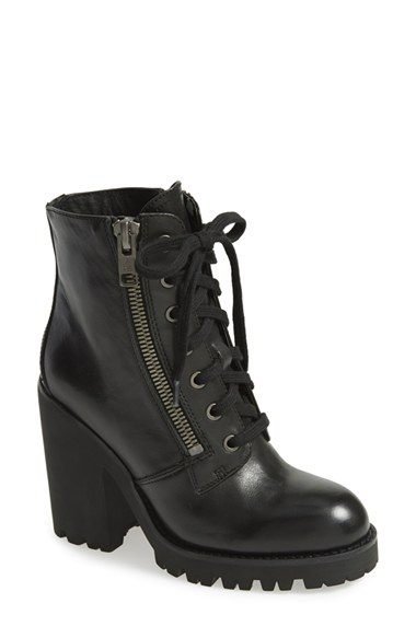 A rubber block heel supports a leather moto boot styled with sleek side zip closures and a laced-up vamp. Color(s): black. Brand: Ash. Style Name: Ash 'Poker' Leather Boot (Women). Style Number: 758287.