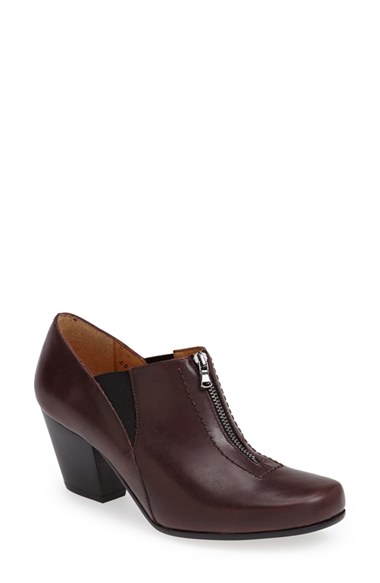 A stacked heel and decorative zipper detail set off the crisp lines of this leather bootie, while a cushioned footbed and stretchy gore inserts provide all-day comfort. Color(s): bordaux. Brand: Fidji. Style Name: Fidji 'L716' Leather Bootie (Wo