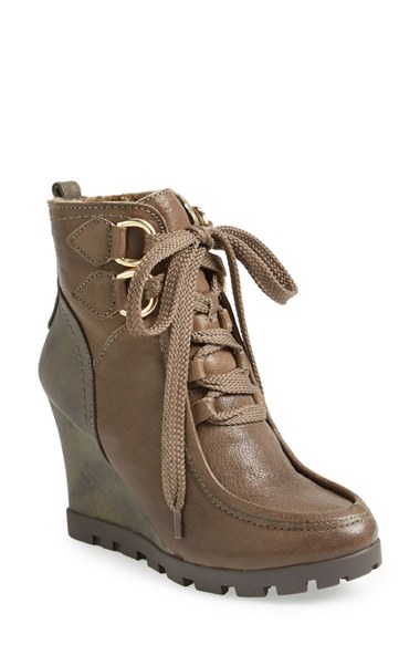 Soft faux fur lines a lace-up wedge bootie set on a trend-right lugged sole. Color(s): green. Brand: GUESS. Style Name: GUESS 'Lanni' Wedge Bootie (Women). Style Number: 800369 1.