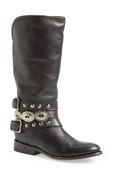 A smooth leather riding boot with wraparound belts at the shaft goes frontier-chic with antiqued silvertone studs and ornaments reminiscent of Western belt buckles. Color(s): black. Brand: Matisse. Style Name: Matisse 'Boone' Western Boot (Women). Style Number: 825992.