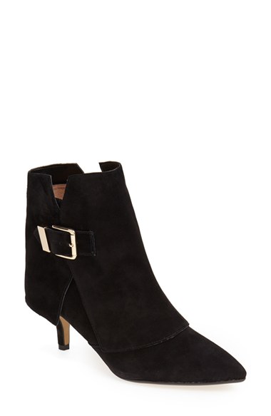 A pointy-toe bootie gets a dash of Western attitude with a belted, chaps-inspired overlay and a lower heel. Color(s): black suede, coffee suede, olive suede. Brand: NINA ORIGINALS. Style Name: Nina Originals 'Fast' Suede Bootie (Women). Style Nu