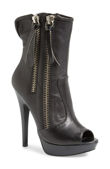 Exposed zippers accent an on-trend peep-toe bootie lifted by a sky-high stiletto heel for street-chic appeal. Color(s): black. Brand: Blonde Salad. Style Name: Peace Love Shea Steve Madden 'Trodeo' Leather Peep Toe Bootie (Women). Style Number: 813817.