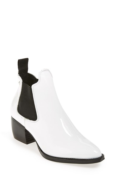 Stretchy side goring insets ease the fit of a smooth leather bootie lifted with a trend-right stacked, chunky heel. Color(s): black, white. Brand: TOPSHOP. Style Name: Topshop 'Margot' Leather Ankle Bootie (Women). Style Number: 871047 1.