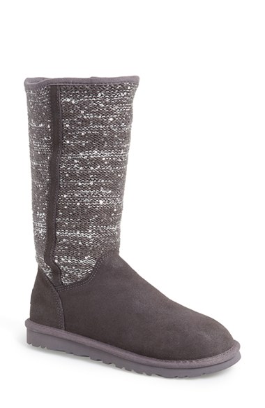 Plush wool awaits your toes on the sockliner of a shimmering suede-and-knit boot speckled with mini-sequins for even more snow-angel shine. Color(s): black, charcoal. Brand: UGG Australia. Style Name: UGG Australia 'Camaya' Boot (Women). Style Number: 762426.
